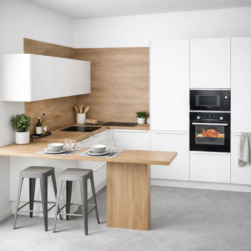 – pracovná doska, zástena a horné skrinky v rovnakom dekore