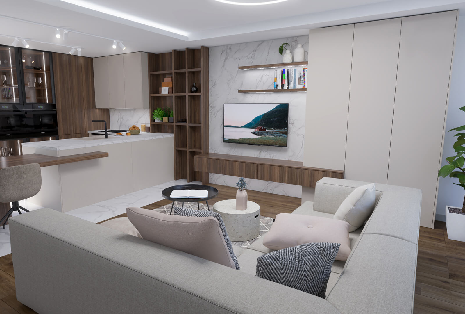 Interiér na mieru v kocepte ALL in ONE. Moderný priestor rodinného domu disponuje otvorenou kuchyňou s jedálňou, ktorá je plynulo prepojená s obývacou časťou. Tento minimalistický interiér oplýva funkčným zariadením i inovatívnymi riešeniami. LED podsvietenie nábytku zaručí pohodlnú prácu pri používaní kuchyne a obývačky, ale zároveň večer môže slúžiť ako efektné orientačné osvetlenie. Farebná paleta sa nesie tón v tóne, krémové až zemité farby v kombinácii s hrejivým Orechom. Kvalitne spracované detaily a elegancia, ktorá sa nesie moderným interiérom je zárukou nadčasového a praktického interiéru DALNO. Použité materiály NaNoTeQ MaTT Kašmír | Orech | Mramor Krištáľový.