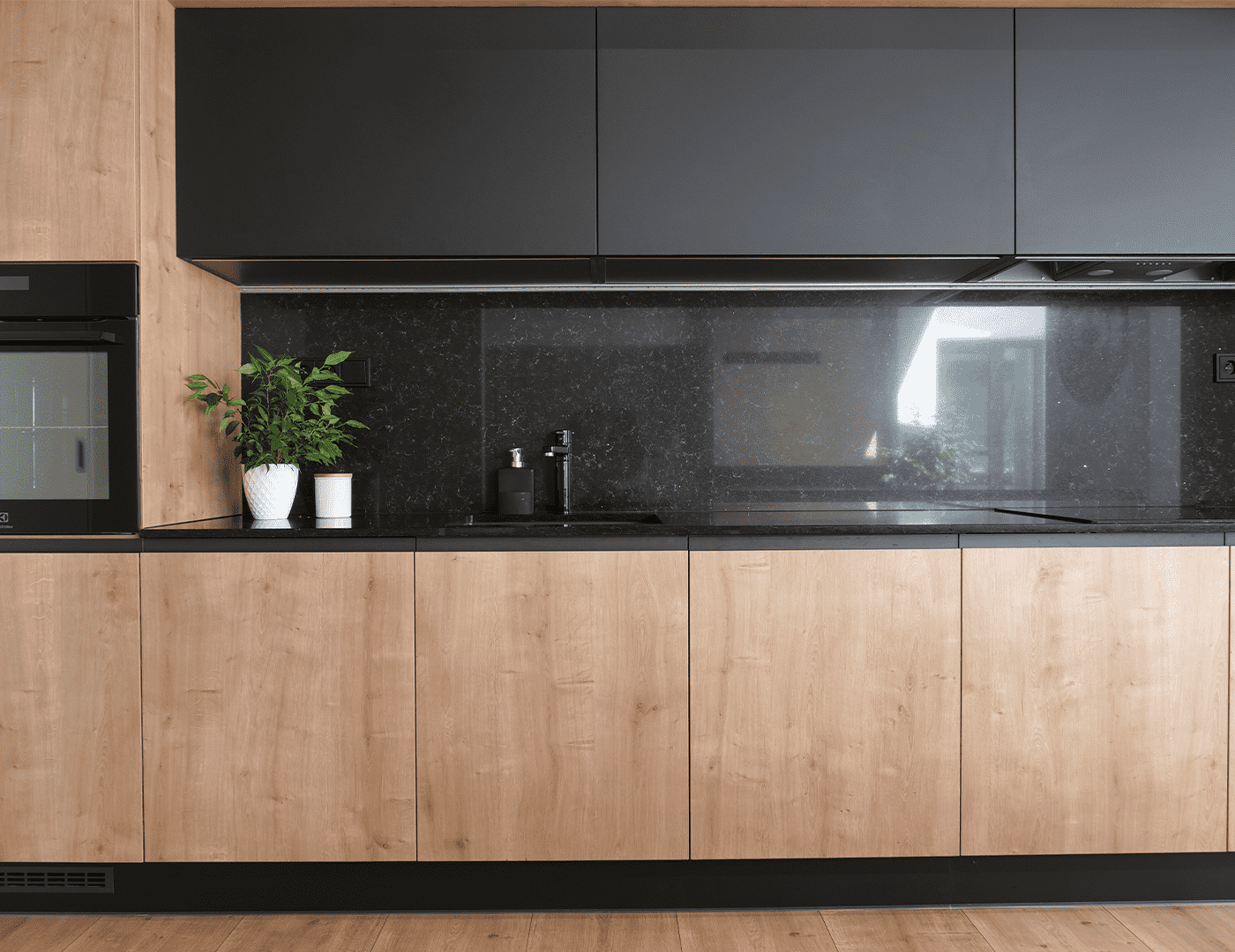 Nadčasový dizajn vo forme dokonalej synchronizácie vybraných materiálov. Priestoru dominuje prírodný drevodekor Dub Arlington. Dramatický odtieň dotvárajú skrinky v čiernom matnom prevedení. Vďaka takejto kombinácii, kuchynská linka Čierna Matt | Dub Arlington | Technistone v sebe odráža svoj osobitý štýl, pôsobí moderne a elegantne.