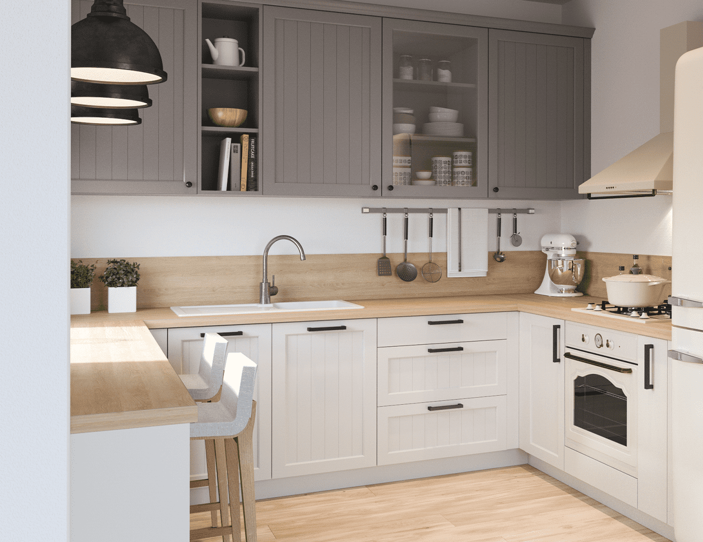 Kuchynská linka Evermatt sivá | Biela | Dub Gladstone zaujme svojím romantickým vzhľadom v ľahkom vintage štýle. Špeciálnou povrchovou úpravou dvierok je technológia NaNo lak Evermatt, ktorá zabezpečuje vysokú odolnosť nielen voči poškriabaniu, ale aj samotným odtlačkom prstov. Dvierka sú výnimočné svojím prirodzeným vzhľadom bez výskytu odlesku. Farebné prevedenie kuchynskej linky sa nesie v jemných sivých tónoch, ktoré sú oživené kombináciou s drevodekorom Dub Gladstone pieskový.