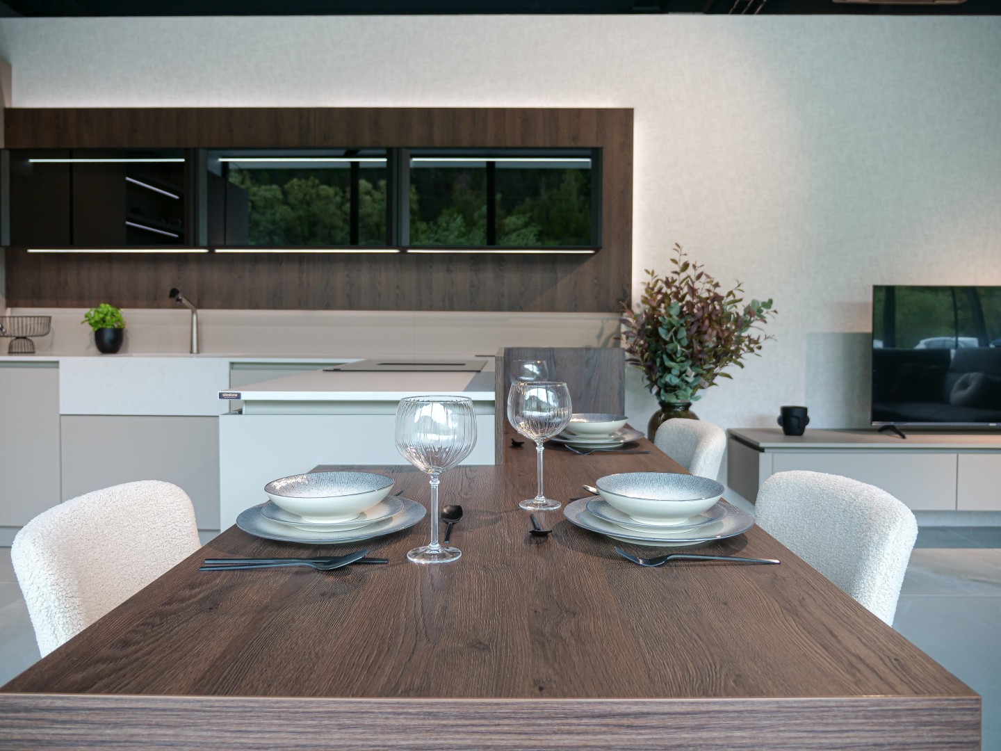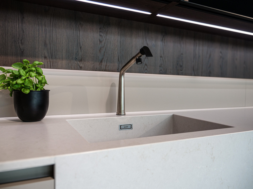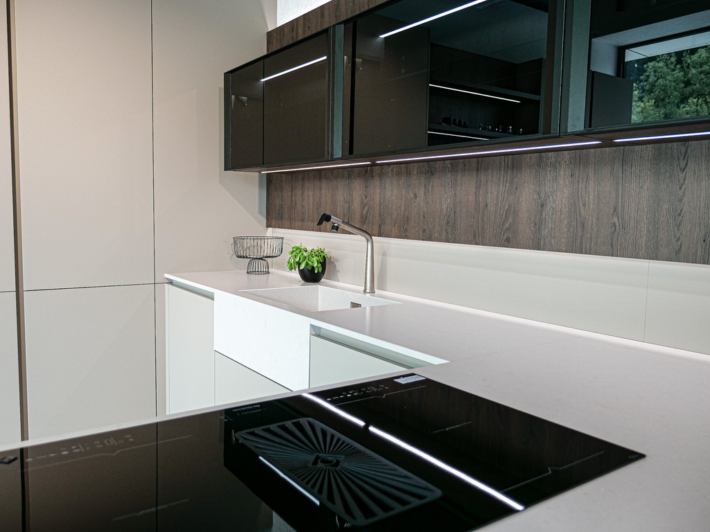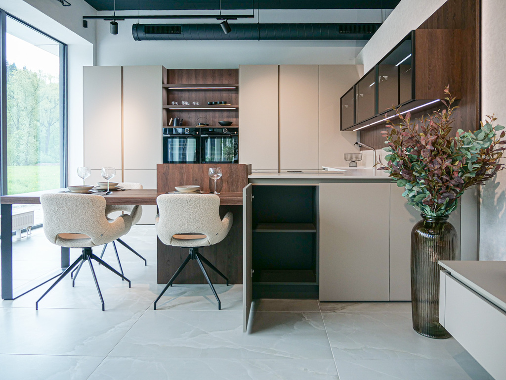 Vitajte v podmanivej kuchyni, ktorá vo vás už v prvom okamihu zanechá neopakovateľný dojem. Dokonalý súlad materiálu Kamenná Šedá s výraznejším drevodekorom Dub Gladstone Tabak prináša do kuchyne krehkú rovnováhu medzi moderným dizajnom a hrejivou útulnosťou domova. Sofistikovaný matný povrch v harmónii s výraznou kresbou tmavšieho dubu navodzuje atmosféru nadčasovej elegancie, v ktorej sa cíti prirodzene majiteľ vysnívanej kuchyne aj každá návšteva. Jej pozornosť zaručene pritiahne praktický kuchynský ostrovček, priamo prepojený s jedálenským stolom. Vďaka tejto fúzii prebieha príprava jedál v kuchyni plynule do pokojných okamihov pri raňajkách či vzácnych večerných rozhovorov. Pracovná doska Salestone Motion Gray so svojou jemnou šedou kresbou dodáva priestoru zjemnený luxusný nádych a taktiež kontrast s elegantnými presklenými skrinkami v hornej časti kuchynskej linky. Všimli ste si nápadité riešenie s otvorenými policami nad a pod spotrebičmi? Integrované LED osvetlenie premieňa tento priestor na mini dizajnovú galériu pre obľúbené kuchynské doplnky a dekorácie. Ak by ste radi túto kuchyňu uzreli na vlastné oči, navštívte náš showroom v domovskom kuchynskom štúdiu Dalno Dolný Kubín a navnímajte ju do posledného detailu.