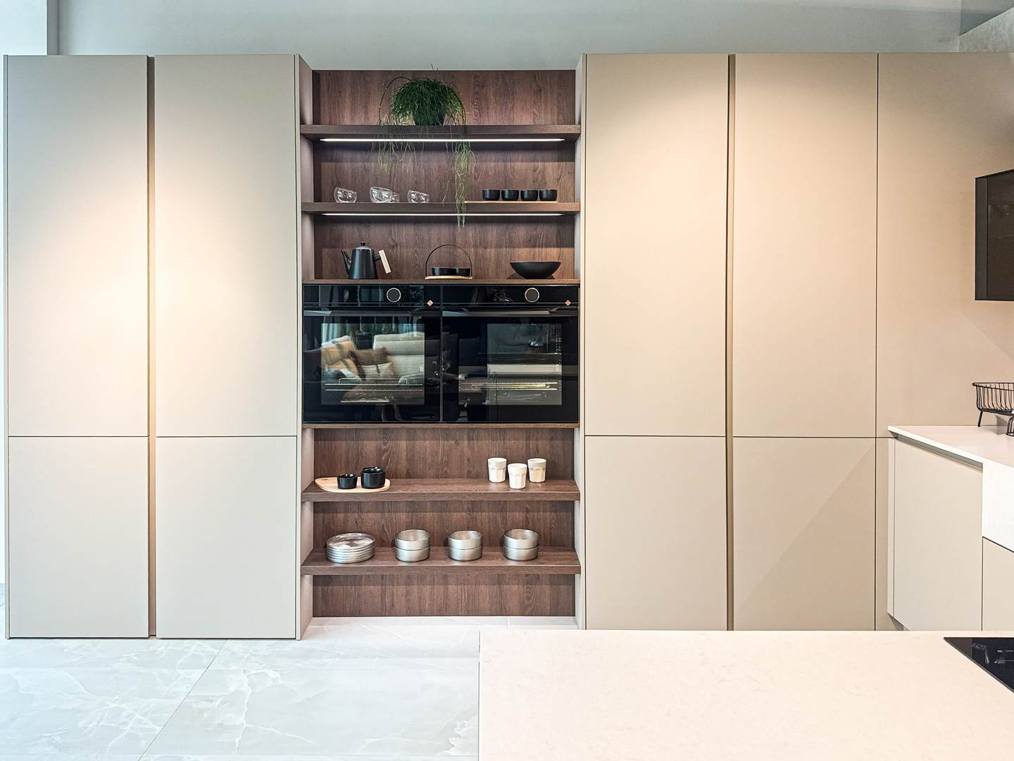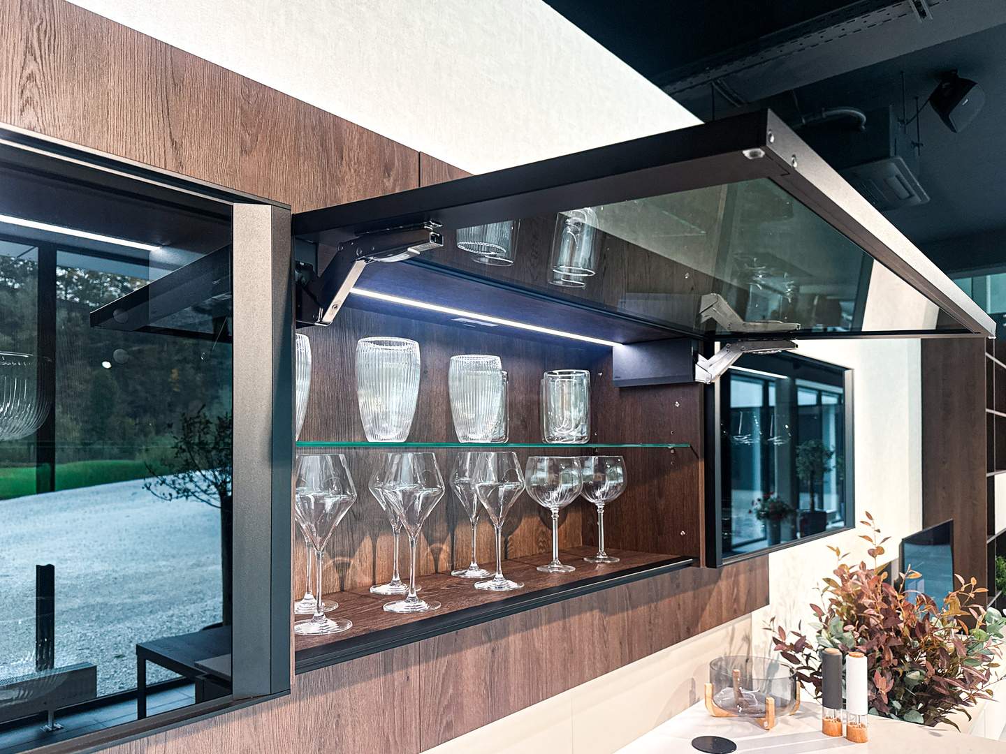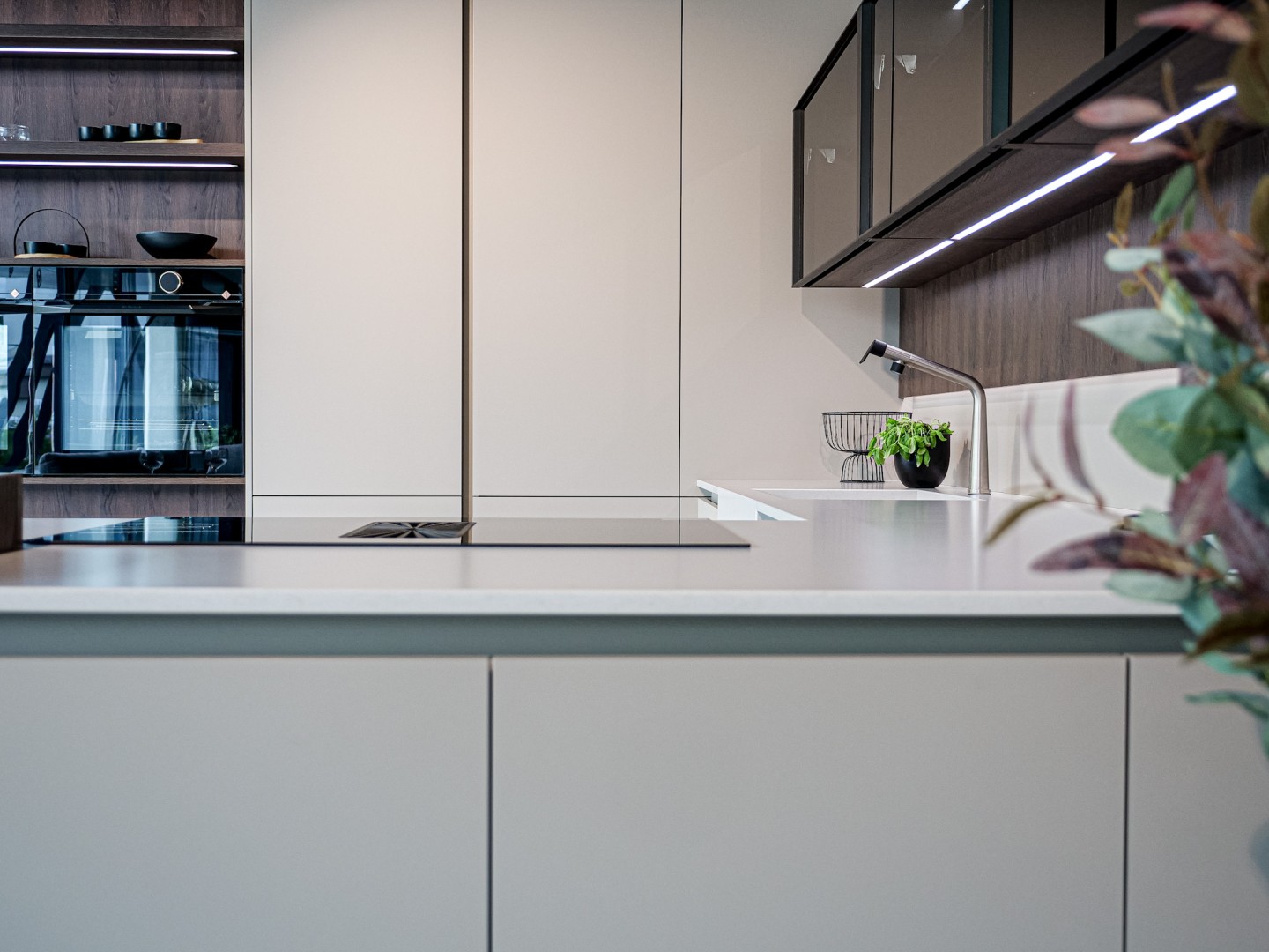 Vitajte v podmanivej kuchyni, ktorá vo vás už v prvom okamihu zanechá neopakovateľný dojem. Dokonalý súlad materiálu Kamenná Šedá s výraznejším drevodekorom Dub Gladstone Tabak prináša do kuchyne krehkú rovnováhu medzi moderným dizajnom a hrejivou útulnosťou domova. Sofistikovaný matný povrch v harmónii s výraznou kresbou tmavšieho dubu navodzuje atmosféru nadčasovej elegancie, v ktorej sa cíti prirodzene majiteľ vysnívanej kuchyne aj každá návšteva. Jej pozornosť zaručene pritiahne praktický kuchynský ostrovček, priamo prepojený s jedálenským stolom. Vďaka tejto fúzii prebieha príprava jedál v kuchyni plynule do pokojných okamihov pri raňajkách či vzácnych večerných rozhovorov. Pracovná doska Salestone Motion Gray so svojou jemnou šedou kresbou dodáva priestoru zjemnený luxusný nádych a taktiež kontrast s elegantnými presklenými skrinkami v hornej časti kuchynskej linky. Všimli ste si nápadité riešenie s otvorenými policami nad a pod spotrebičmi? Integrované LED osvetlenie premieňa tento priestor na mini dizajnovú galériu pre obľúbené kuchynské doplnky a dekorácie. Ak by ste radi túto kuchyňu uzreli na vlastné oči, navštívte náš showroom v domovskom kuchynskom štúdiu Dalno Dolný Kubín a navnímajte ju do posledného detailu.