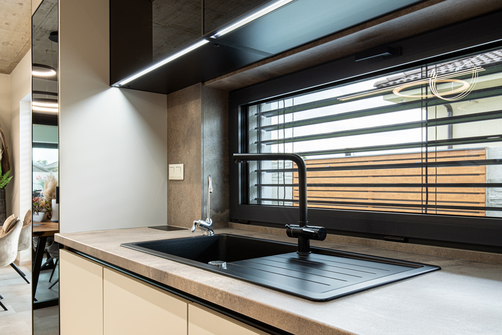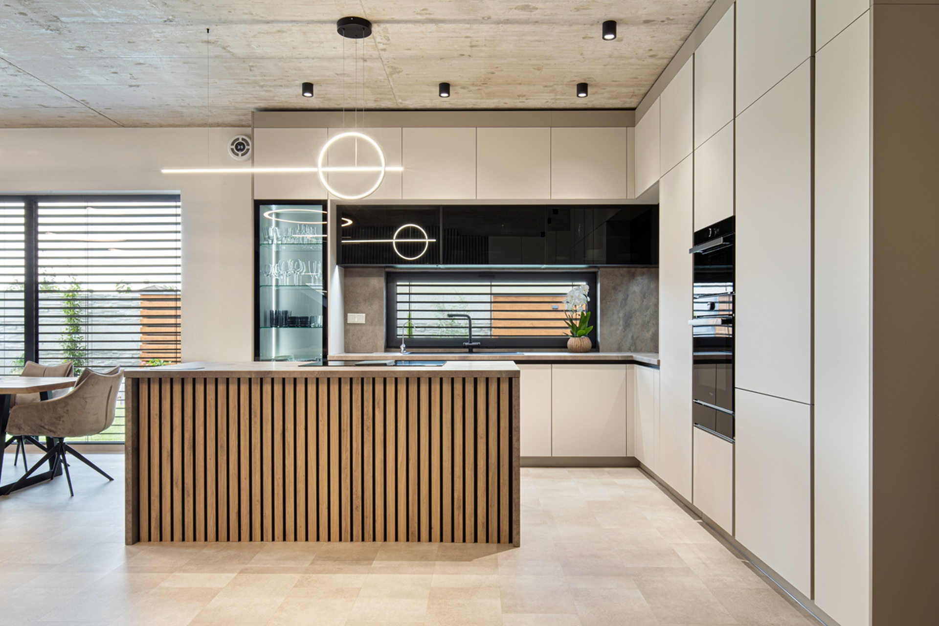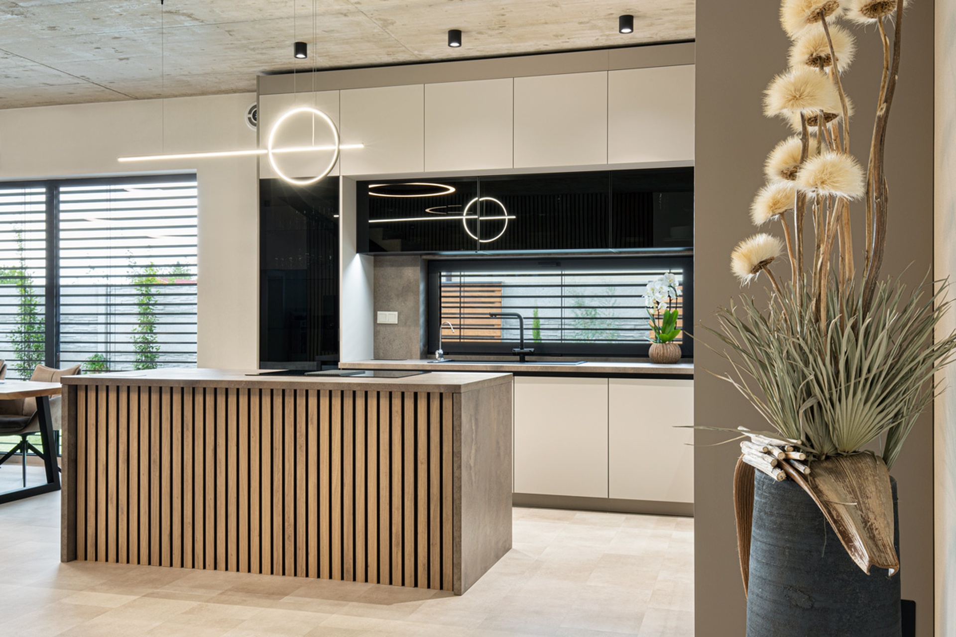 Nahliadnite do realizácie modernej rohovej kuchyne, ktorá kombinuje decentné tóny Kašmíru Matt s industriálnym pôvabom Titanitu Pieskovo Béžová a naturálnosťou dreveného dekoru Dub Chalet. Kašmírové matné dvierka skriniek vytvárajú príjemný kontrast k tmavým horným plochám nad pracovnou doskou. Originálnym dizajnovým prvkom sú v tejto kuchyni drevené lamely na čelnej strane ostrovčeka, ktoré vnášajú do priestoru prirodzený rytmus a dynamiku. Kuchynský ostrovček zároveň ponúka dodatočnú pracovnú plochu pre každodenné varenie aj odvážne experimenty. Všetko potrebné kuchynské vybavenie a potraviny ukryjú elegantné vysoké skrinky siahajúce k stropu, vďaka čomu sa v kuchyni využije každý centimeter priestoru. Moderný akcent kuchyne skvele dopĺňa zabudovaná vitrína s tmavým sklom. Ak si k tomu domyslíte na pohľad ukryté kvalitné kovanie Blum a Hettich a efektívne vnútorné vybavenie je jasné, že budú všetky kulinárske dobrodružstvá v tejto kuchyni na mieru sprevádzané pohodlím a funkčnosťou. Za touto inšpiratívnou realizáciou stojí autorizované kuchynské štúdio Dalno Dunajská Streda.