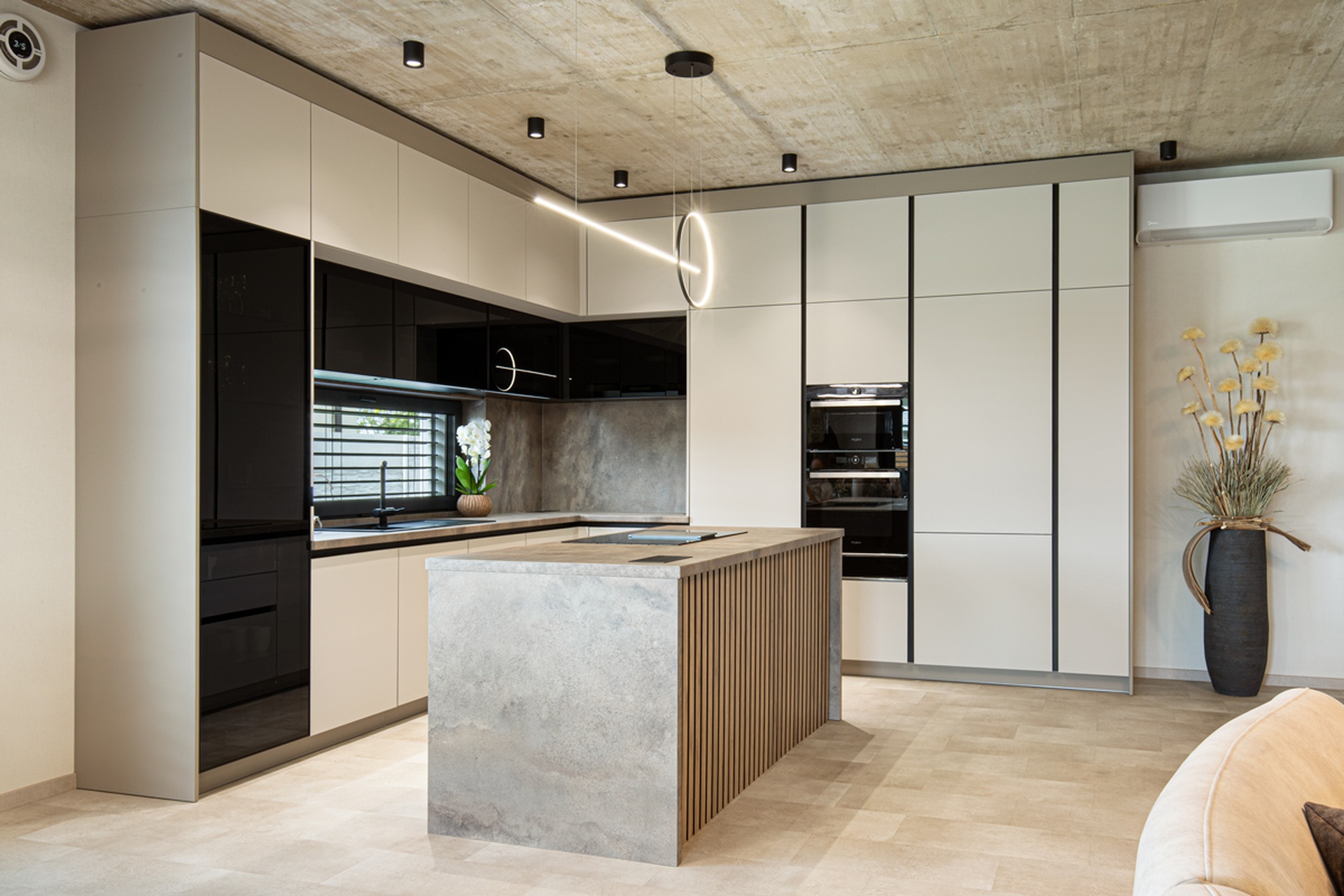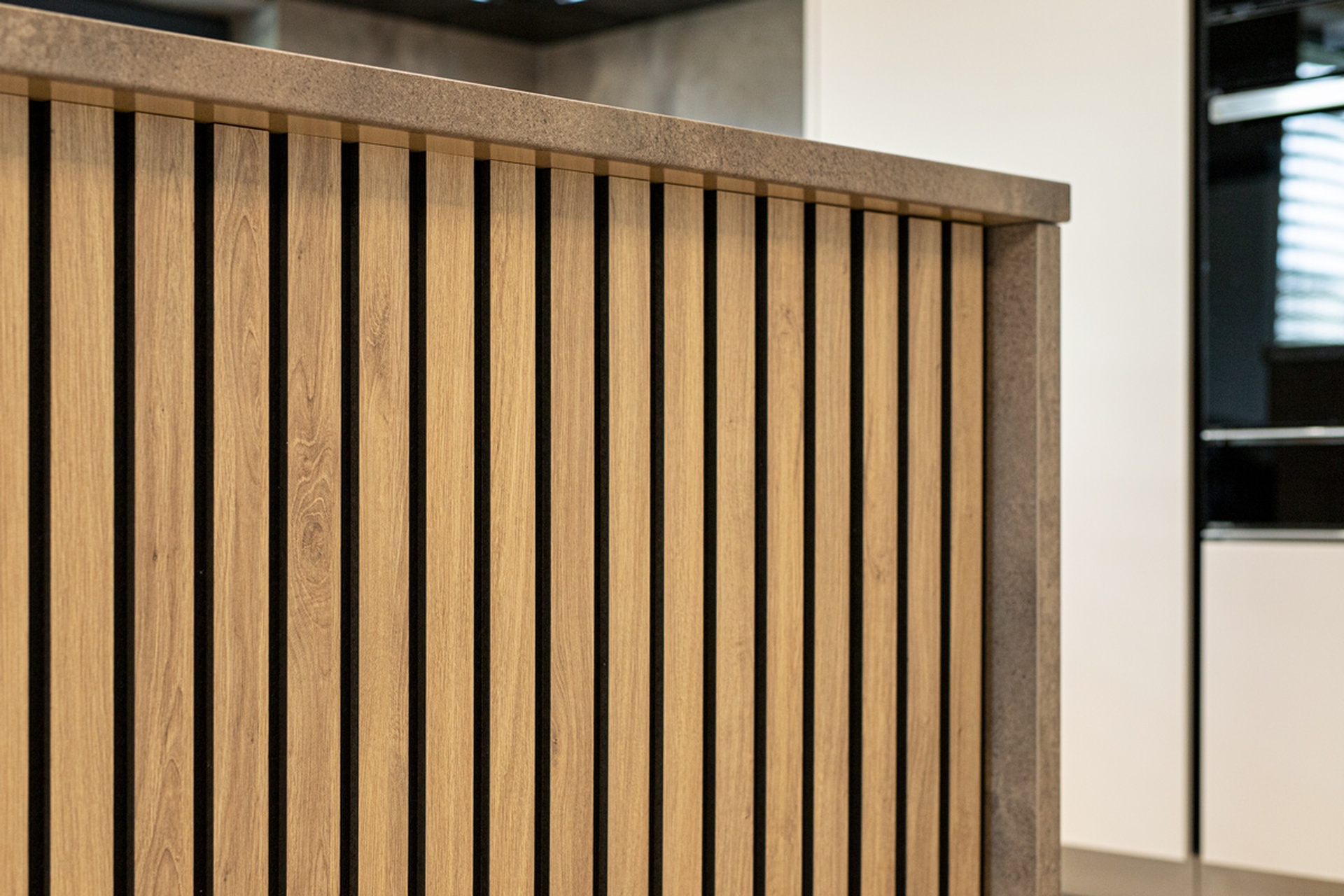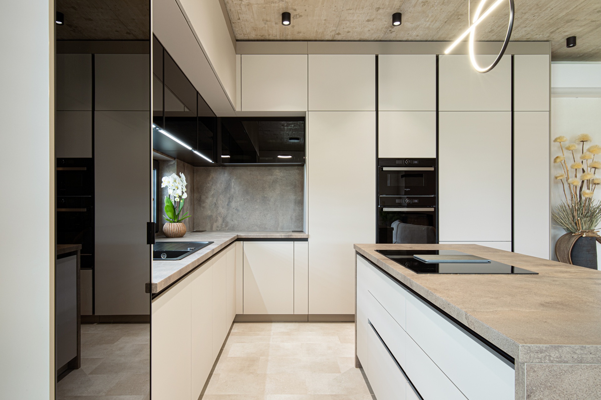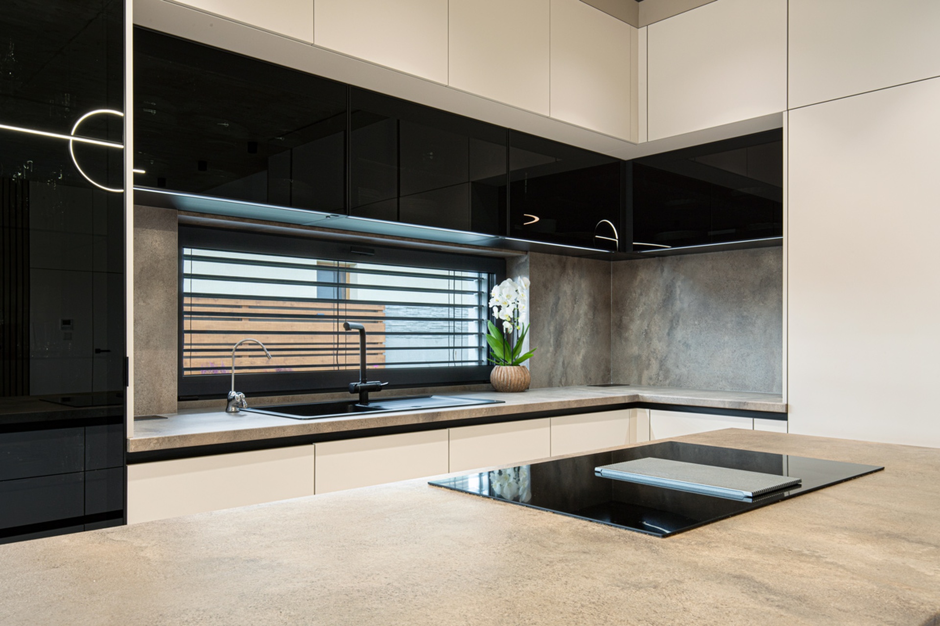 Nahliadnite do realizácie modernej rohovej kuchyne, ktorá kombinuje decentné tóny Kašmíru Matt s industriálnym pôvabom Titanitu Pieskovo Béžová a naturálnosťou dreveného dekoru Dub Chalet. Kašmírové matné dvierka skriniek vytvárajú príjemný kontrast k tmavým horným plochám nad pracovnou doskou. Originálnym dizajnovým prvkom sú v tejto kuchyni drevené lamely na čelnej strane ostrovčeka, ktoré vnášajú do priestoru prirodzený rytmus a dynamiku. Kuchynský ostrovček zároveň ponúka dodatočnú pracovnú plochu pre každodenné varenie aj odvážne experimenty. Všetko potrebné kuchynské vybavenie a potraviny ukryjú elegantné vysoké skrinky siahajúce k stropu, vďaka čomu sa v kuchyni využije každý centimeter priestoru. Moderný akcent kuchyne skvele dopĺňa zabudovaná vitrína s tmavým sklom. Ak si k tomu domyslíte na pohľad ukryté kvalitné kovanie Blum a Hettich a efektívne vnútorné vybavenie je jasné, že budú všetky kulinárske dobrodružstvá v tejto kuchyni na mieru sprevádzané pohodlím a funkčnosťou. Za touto inšpiratívnou realizáciou stojí autorizované kuchynské štúdio Dalno Dunajská Streda.