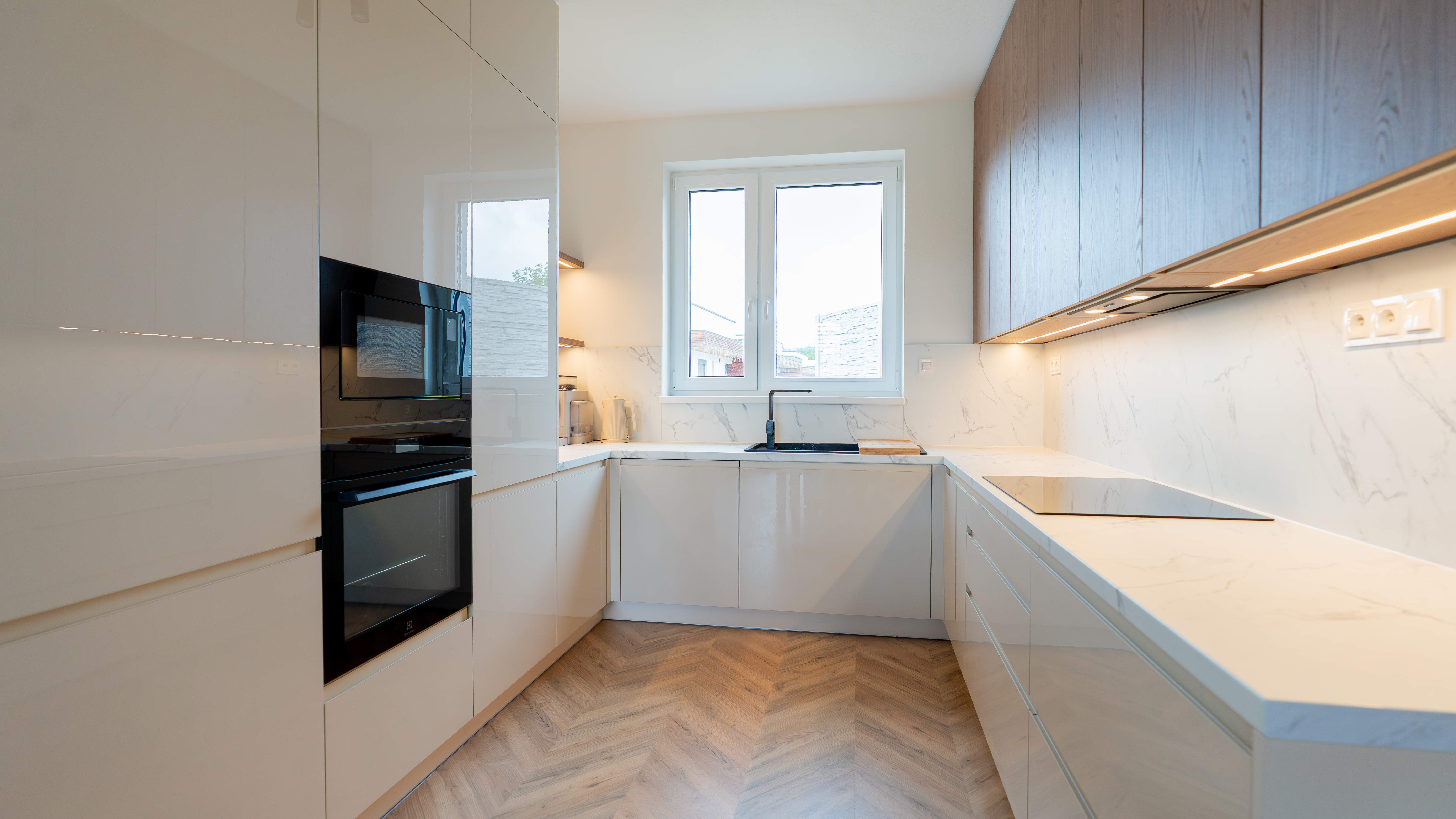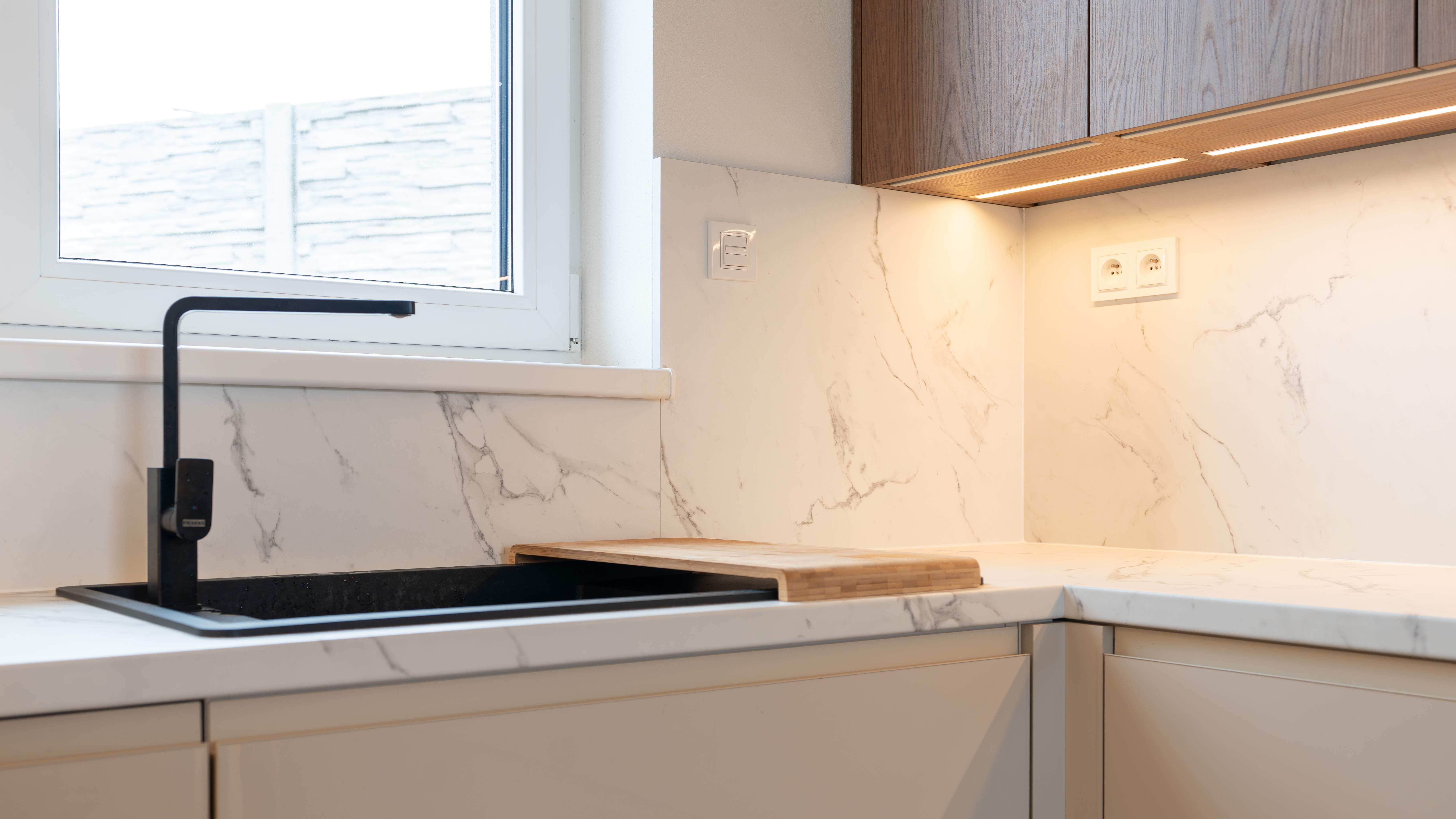 Ak ste doteraz márne hľadali tú pravú kuchynskú linku, ktorá je jemná, presvetlená a zároveň vhodná aj do malého priestoru, máme pre vás inšpiráciu. Táto nežná kráska v prevedení Satin Lesk dokonale pracuje s odrazom svetla od hladkých plôch, vďaka čomu pôsobí interiér vzdušne, uhladene a kultivovane. Druhé husle ladí v tejto dizajnovej súhre pracovná doska mramor Levanto, použitá aj na kuchynskej zástene. Horné skrinky v dekore Dub Casella dodávajú kuchyni hrejivý tón a vizuálnu rovnováhu. Vďaka tomu nadobúda celý priestor nádych útulnosti a atmosféru domova. Dispozične je kuchyňa navrhnutá tak, aby podporovala plynulý pohyb a prirodzený komfort pri každodennom varení. Čisté línie, vstavané spotrebiče a premyslené osvetlenie vytvárajú harmonický celok, ktorý kráča ruka v ruke s aktuálnymi trendmi, no zároveň obsahuje všetky prvky nadčasovosti. Pod taktovkou autorizovaného kuchynského štúdia Dalno Trenčín tak vznikla jedinečná kuchyňa, ktorá v sebe spája nádych bieleho luxusu, dotyk domova a zároveň nečakanú vzdušnosť v menšom priestore. Už sa vám v hlave rysuje predstava vašej vysnívanej kuchyne? Radi ju premeníme na realitu.
