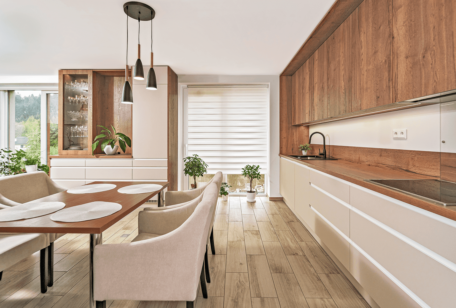 Očarujúca kuchynská linka zdobí interiér rodinného domu. Hrejivé, zemité odtiene nábytku dotvárajú moderný dizajn. Svetlé dekory v kombinácii s koňakovým dubom sú skvelým riešením pri vytvorení príjemnej atmosféry vo vašom priestore. Zaujímavým prvkom je nábytková stena s vitrínou, ktorá moderným spôsobom nahrádza klasický príborník. Použité materiály sú Satin Matt a exkluzívny Dub Cognac.